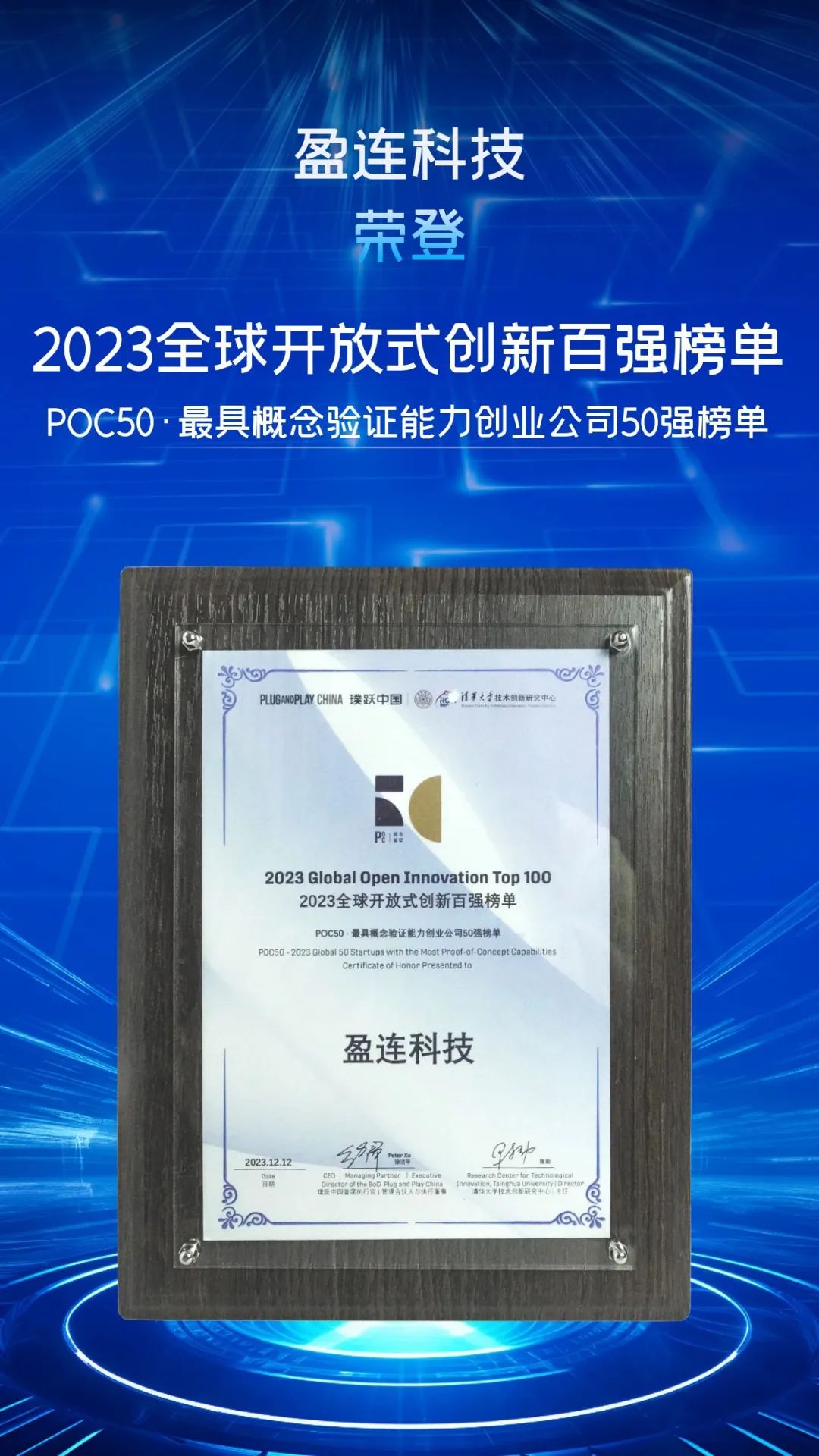 盈连科技凭借高成长性和创新能力荣登“全球开放式创新百强榜单-POC50·最具概念验证能力创业公司50强”。