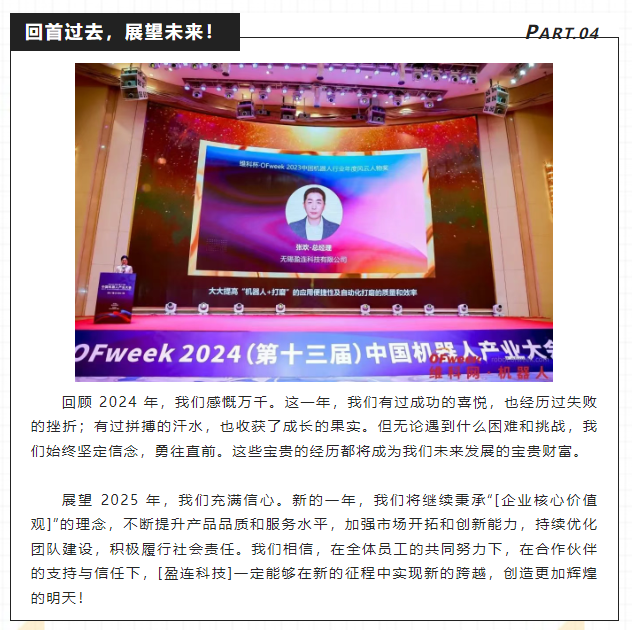 站在岁末回首,2024 年如同一幅波澜壮阔的画卷在我们眼前徐徐展开。这一年,对于[盈连科技]而言,是充满挑战、拼搏与成长的一年。我们在复杂多变的市场环境中披荆斩棘,在激烈的行业竞争中砥砺前行,用汗水和智慧书写了属于我们的篇章。